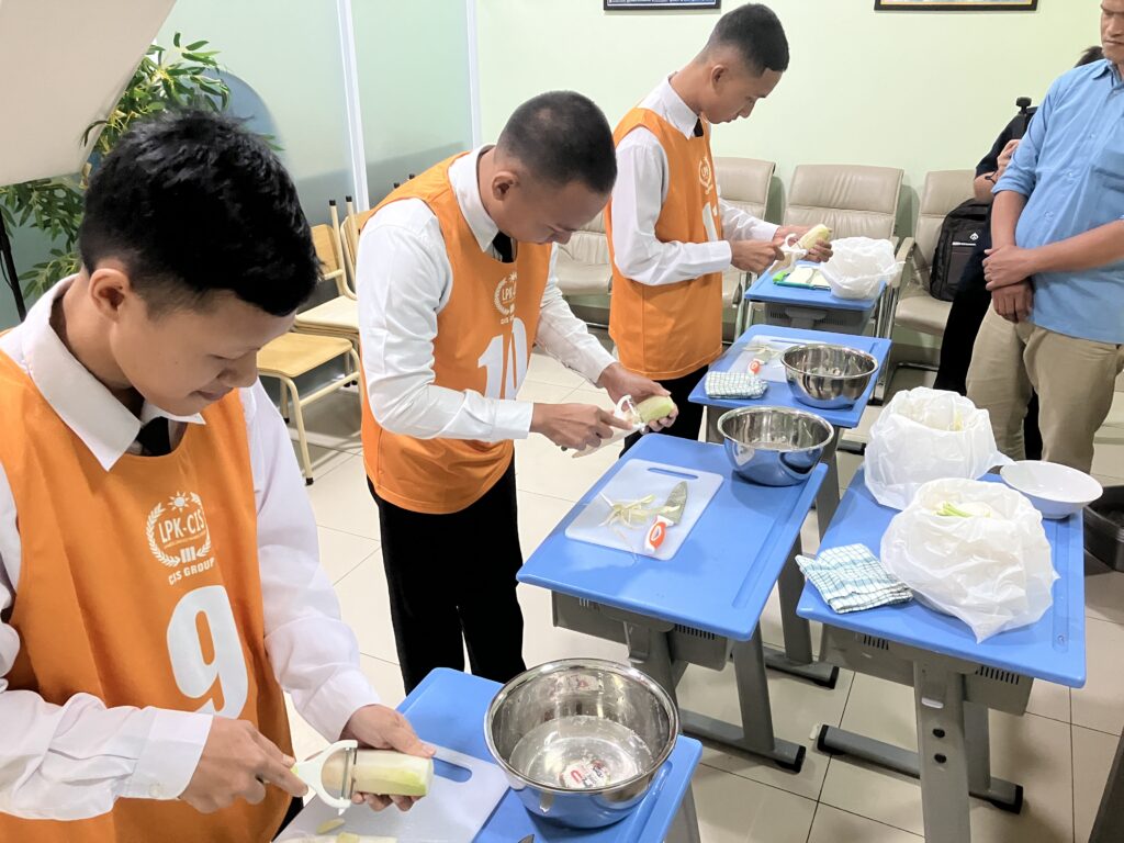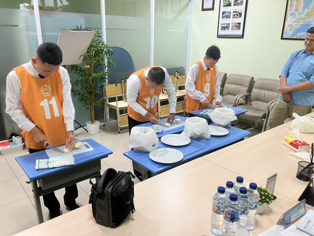 面接では、重いものを持つ体力測定として、15kgの荷物が入った段ボール箱を15回持ち上げる確認テストを行い、実技試験として、玉ねぎのみじん切り、大根の皮むき・スライス等を行いました。